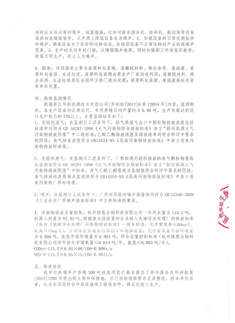 關于杭州維惠生物科技有限公司新增年產香精300噸技改項目的環境保護設施竣工驗收意見
